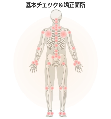 どんな症状の方でも骨格の基本となる部位(最低30箇所)のテスト&矯正を行い、それにあなたの症状の原因となる部位のテスト&矯正を付加して施術を行います。